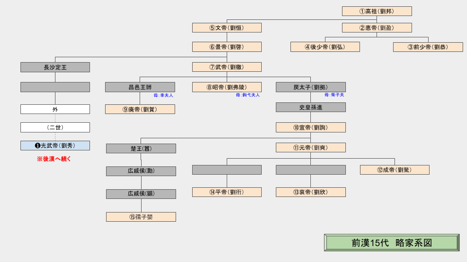 - 孺子嬰は「皇帝」ではなく「皇太子・孺子」として即位させられたが、実質的に漢の最後の君主として皇帝一覧に含めることが多いです。